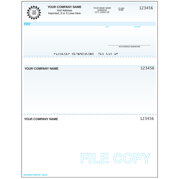 750L Check on Top SKU: 750L $2.80 Select options Back $2.80 REPEAT, NEW, OR REPEAT WITH CHANGES ? : Repeat New Repeat With Changes Prior Job# Reverse Numbering : No Yes Check Start Number Number of Signature Lines : NONE 1 2 3 Special Instructions COLOR: Company Information Line 1 Company Information Line 2 Company Information Line 3 Company Information Line 4 Company Information Line 5 City State Zip Phone Fax Email Bank Name Bank Address Bank Address 2 Routing Number Account Number Imprint Below Signature Line Title Above Signature Line Text on Check Stub SELECT LOGO COLOR : Black Reflex Blue Process Blue Teal (PMS 320) Green (PMS 348) Green (PMS 347) Brown (PMS 464) Maroon (PMS 201) Burgundy (PMS 208) Warm Red Red (PMS 185) Orange (PMS 151) Gray (PMS 423) Custom Color Logo & Options : $0 - Color Logo $68 - Black Logo $90 - Color Logo No Charge - 1 Color Logo No Charge - Black Logo EZ-Shield : No Yes Quantity -+ Please select options before adding to cart Add to Cart Add to Cart